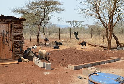 Onze eerste stop is bij een huisje langs de weg: Hercules wil graag laten zien hoe de mensen hier wonen. Dat blijkt een schot in de roos: het is -vooral achteraf gezien- een van de weinige keren dat we echt met de lokale bevolking kennismaken. We rijden een stukje ‘het land in’ en dan lopen we verder naar het ‘erf’. We zien er een paar geitjes en moeder geeft juist de jongste wat te drinken. Vader blijkt bezig met het bouwen van een nieuw huis: er liggen allerlei steenblokken die als basis moeten gaan dienen. Maar eerst bekijken we hun huidige onderkomen: een hutje met het meest basale meubilair. Een tweepersoonsbed, een tafel, een stoel, een kastje zonder deurtjes. Het ontbijt -tenminste, dat neem ik aan- staat nog op het tafeltje. Ze voelen zich zeer vereerd met de belangstelling. Ook de kinderen zijn blij, want Maike heeft balpennen mee. Hoewel ze er ieder eentje wil geven, zijn ze heel gewiekst in het verbergen van wat ze al hebben gehad en zetten hun allerzieligste gezicht op om er nog eentje te bemachtigen. Dat lukt!