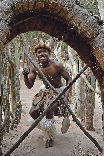 Het is heel leuk hoe we er worden opgevangen: de toegang is met speren geblokkeerd. Pas na het aanroepen van een soort code wordt de poort geopend en mogen we naar binnen. Daar krijgen we van een gids eerst uitleg over het leven van de Zulu’s en laten zij zien welke producten ze maken: speren, schilden, potten en diverse soorten kettingen. We krijgen ook uitleg over de kleding die de vrouwen dragen (die van de mannen heeft niet zoveel om het lijf).