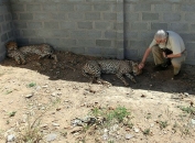 Dan mogen we een voor een naar de cheetah’s toe lopen en ze aaien. Een geweldige ervaring! Onze kat Sylvester was al een ”goeie spinner”, maar deze twee overtreffen alles. Als je ze aait, is het op een paar meter afstand te horen. Daaruit blijkt in ieder geval -toch wel tot onze geruststelling- dat ze het naar hun zin hebben. Loes bekijkt het van een afstandje, maar wil gelukkig wel mijn actie met de camera vastleggen.