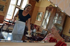 We besluiten er een kijkje te nemen. Het blijkt niet alleen een tearoom, maar is er ook een boekwinkeltje, een antiekhandel en twee antiek ingerichte kamers. Ik maak ook een foto van de trapopgang met historische schilderijen en dan komen we bij Charlotte. In één woord: geweldig! Wat een heerlijke origineel oude Engelse sfeer. De dames lopen in het zwart met een wit schort en een wit-met-zwart kapje. We besluiten dan toch maar iets te nuttigen en Loes weet al snel haar keuze: Luxury Icecream van drie bolletjes met clotted cream. Ik doe met haar mee.