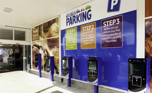 Nog maar nauwelijks geparkeerd komt Tom al uitleg geven over het systeem. Je doet eerst op je gemak boodschappen, waarbij je voor tenminste drie pond moet besteden (dat blijkt het tarief te zijn dat de naastgelegen commerciële parkeerplaats vraagt; maar ja: wij hebben daar dan ook nog lekker bier en een schaaltje vleeswaren voor). Bij de kassa krijg je een parkeerticket. Buiten bij de scanner toets je drie tekens van je nummerbord in, ziet plaatjes van kentekenplaten die er op lijken en je kiest de juiste. Dan het ticket voor de barcodelezer valideren en je kunt maximaal twee uur gratis staan. Let op: niet binnen een uur terugkomen, want dat geldt als niet-betalen en dan kost het je 70 pond.