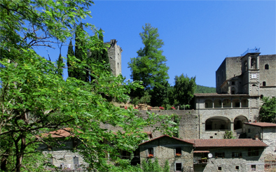 We vervolgen de route en houden daarbij vooral Fosdinova aan: een mooi gelegen dorp met een kasteel. Dat kunnen we zeker niet recht-toe-recht-aan doen, want er zit een hele serie stevige haarspelden in. Als ik op Germaine kijk, zie ik dat de weg bij haar bijna in een knoop ligt.