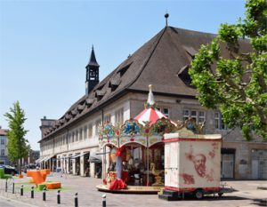 Montbéliard wordt wel de stad van de drie P’s genoemd, zo leren we uit onze reisgids: protestantisme, puritanisme en Peugeot. Dat laatste is een van de kenmerkende inkomsten voor dit gebied: veel industrieën, waaronder dus de auto-industrie. Die twee geloven -katholicisme en protestantisme, met dus ook in bijna elke gemeente twee kerken- komt mede doordat dit gebied vier eeuwen tot Würtemberg behoorde. Door het vele cultureel erfgoed dat hier te vinden is, mag de stad zich de Ville d’Art et d’Histoire noemen. Je ziet hier ook veel gebouwen in renaissancestijl. Dat is te danken aan een van de inwoners: de belangrijke architect Schickhart.