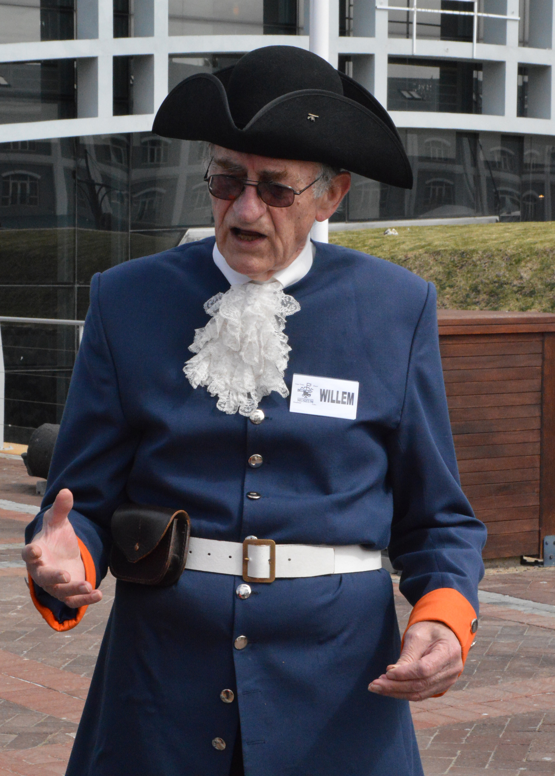 Na een heerlijke maaltijd gaan we naar de ..brug, om ook nog even aan de andere kant bij de haven rond te kijken. Helaas: de brug is open. Maar dat blijkt niet erg, want er vindt een vlootschouw plaats. Op de kade staan enkele heren in historisch kostuum en er worden met enige regelmaat mini-kanonnen afgevuurd. De knallen die zij produceren zijn echter allerminst mini: het publiek wordt uit de buurt gehouden en het is beter bij het schot beide oren dicht te houden. Dat is alleen erg lastig als je tegelijkertijd wilt fotograferen. Gelukkig herinner ik me -jammer genoeg pas bij de derde klap- dat ik in mijn tasje oordopjes heb zitten, om zonodig in het vliegtuig te gebruiken. Die gaan dus in.